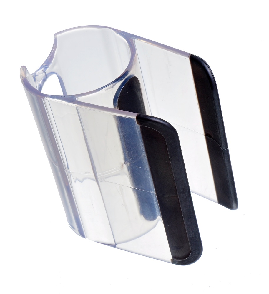 Držák je vyroben z kvalitního a pevného čirého plastu, který je doplněn černým měkčeným plastem na dosedací ploše a volných koncích držáku. Tato kombinace zajišťuje: