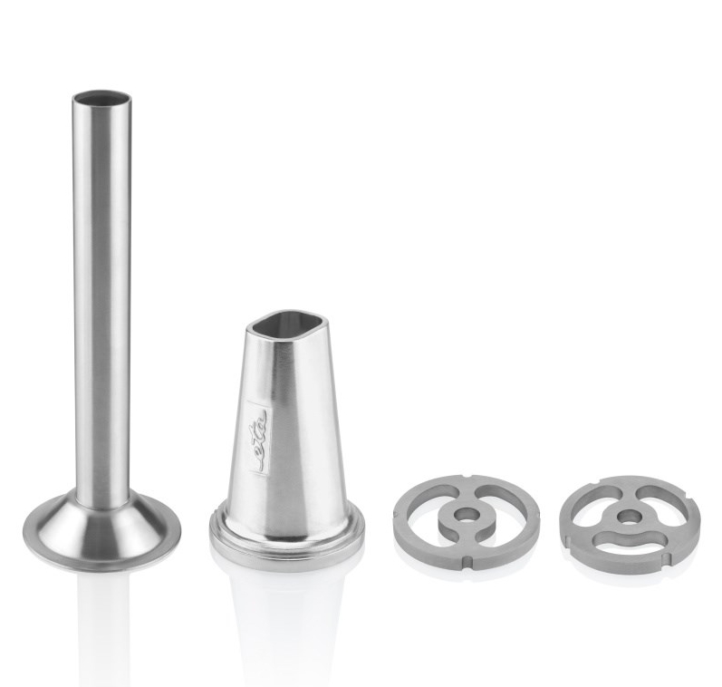 Nalaďte se na grilování v domácím stylu. Vyrobte si domácí maso na hamburgery, klobásky či párky a vychutnejte si jejich čerstvost a kvalitu.Kromě mletí masa a výroby domácích uzenin můžete nástavec využít i k přípravě domácího sádla, tradičních jitrnic a jelítek. Tento nástavec vám tak bude parádním pomocníkem při každé zabíjačce.Při mletí masa si můžete zvolit hrubé nebo velmi hrubé mletí, a to za pomocí dvou nerezových destiček. K výrobě uzenin využijete nerezový nástavec o průměru 20 mm. Samozřejmostí je i ochranný kryt pro zajištění bezpečnosti. nerezové díly můžete mýt v myčce nádobí.Nástavec na přípravu klobásek a mletí masa lze použít pouze s masomlýnkem o průměru 62 mm ETA002891000, který poznáte podle 6 výstupků na utahovací matici.