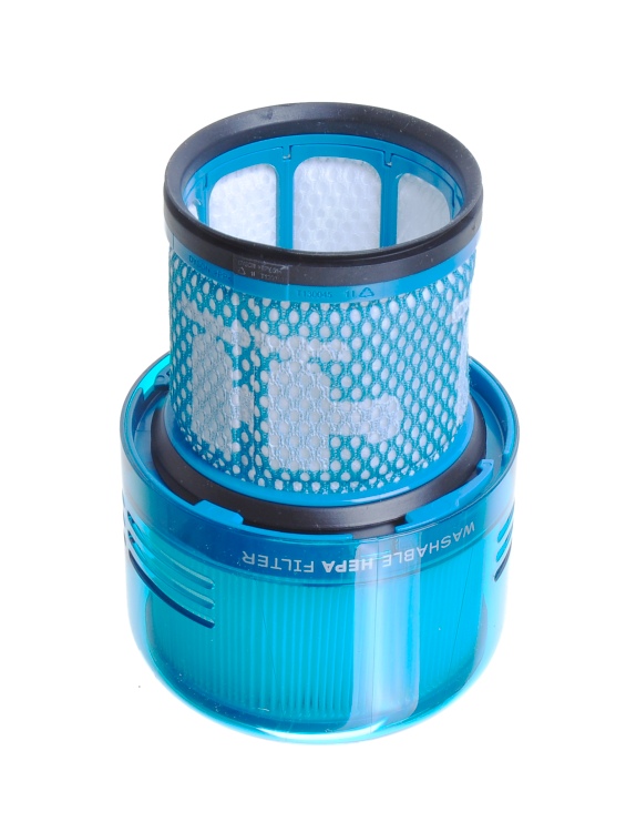 Filtrační jednotka je tvořena dvěma částmi spojenými do jednoho celku – látkovým mikrofiltrem a skládaným HEPA filtrem. Obě části jsou omyvatelné pod vlažnou tekoucí vodou. Vysavače Dyson samy upozorňují na nutnost čištění filtru prostřednictvím hlášení na displeji, obvykle v intervalu přibližně jednou za měsíc.